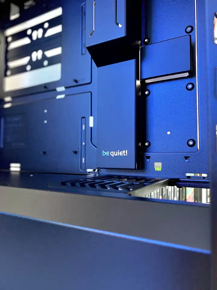 À l’intérieur du Shadow Base 800, on découvre une architecture compartimentée bien pensée. L’espace principal peut accueillir une carte mère au format E-ATX, ATX, M-ATX ou Mini-ITX, offrant ainsi une grande flexibilité pour le choix de votre carte mère. De plus, il réserve 430 mm de longueur pour la carte graphique et 180 mm de hauteur pour le ventirad, ce qui signifie que vous pouvez installer des composants massifs sans vous soucier de la compatibilité.