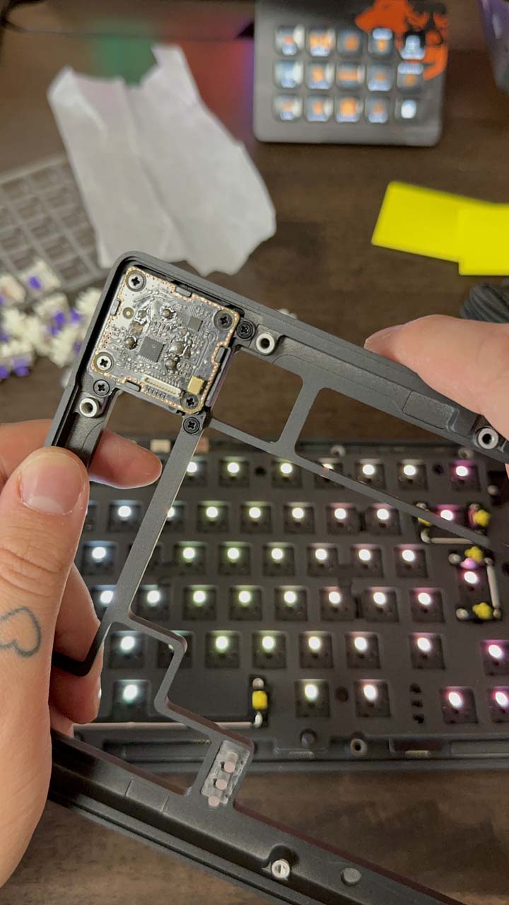À partir de ce moment vient le choix de la plaque de commutation. C’est ici que va se jouer le profil acoustique du clavier. Il y a deux options possibles – la première est une plaque FR4 plus rigide ou une plaque en polycarbonate. Le choix de l’une ou l’autre sera entièrement dépendant des préférences de chacun, sans réel avantage technique de l’une par rapport à l’autre.