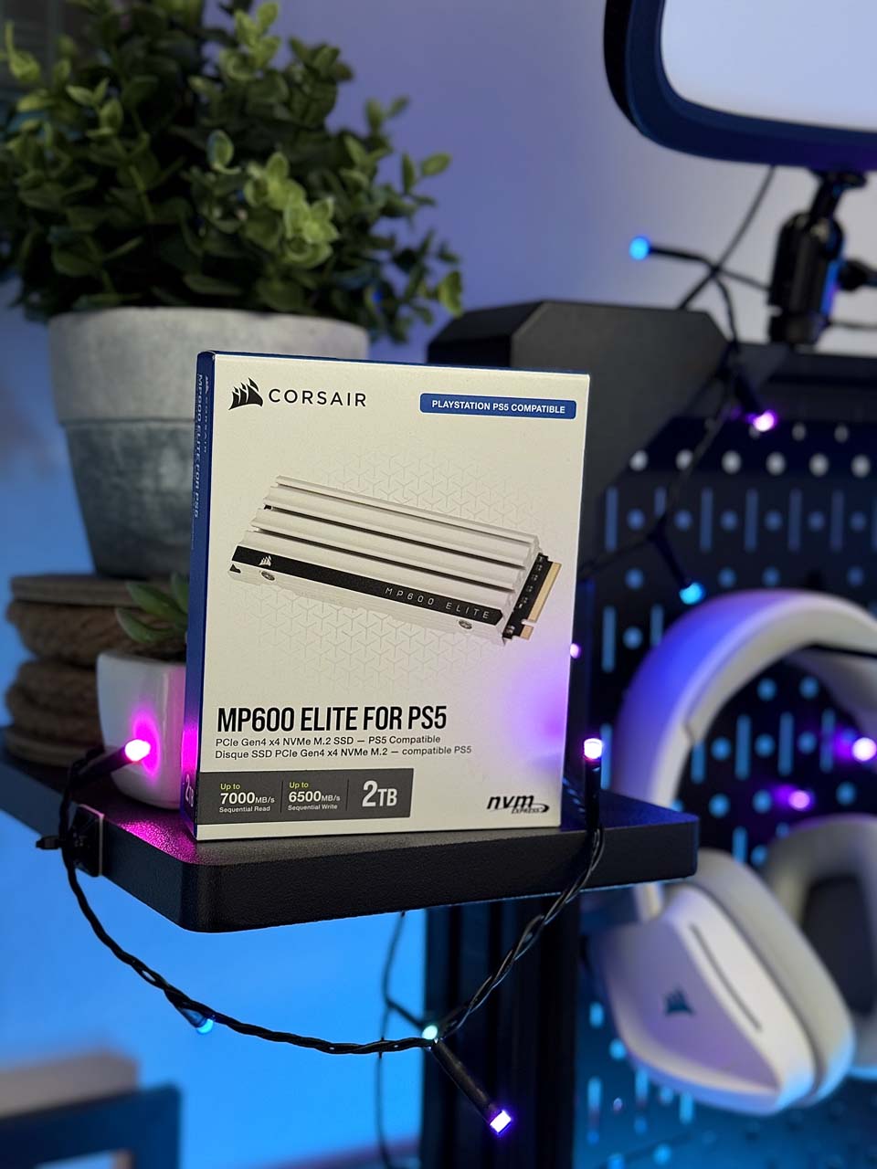 Le Corsair MP600 Elite « pour PS5 », ici testé en version 2 To, arrive avec une promesse simple : offrir une extension de stockage rapide, fiable et parfaitement intégrée à la PS5. Il coche toutes les cases côté fiche technique : format M.2 2280, interface PCIe Gen4 x4, NAND 3D TLC, une endurance de 600 TBW et des vitesses séquentielles théoriques allant jusqu’à 7 000 Mo/s en lecture et 6 500 Mo/s en écriture.