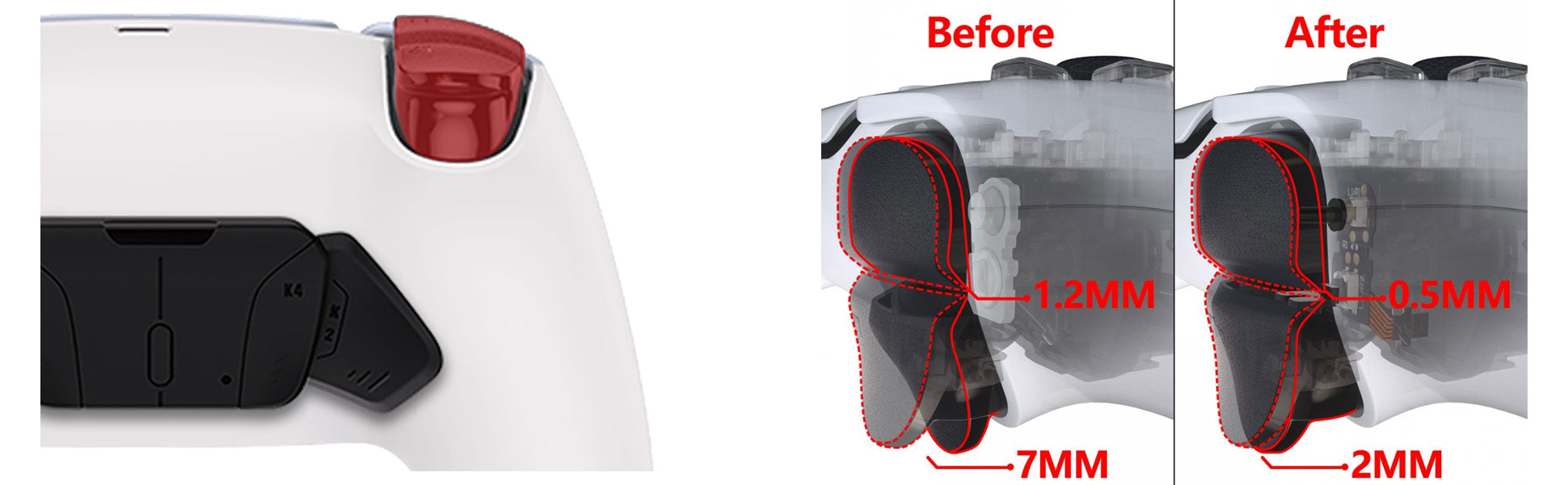 Enfin, la principale différence entre cette version Rival Pro et la manette Ultimate est la course d’activation des gâchettes R2 et L2. Ce point est primordial dans votre choix de manette HexGaming. A la place de la traditionnelle course de 7mm qui permet notamment de doser ses accélérations dans un jeu de voiture, la Rival Pro ne possède qu’une course de 2mm, ce qui permet de gagner pas mal de temps lorsque l’on tire dans un shooter. En revanche, il n’est pas possible de revenir à une course normale. Les gâchettes ont intentionnellement été modifiées pour être bloquées à ce stade et sont donc incompatibles avec les jeux de voiture. Qui plus est, la fonction de gâchettes adaptatives est aussi réduite à néant. C’est un peu dommage de ne pas pouvoir profiter d’un système comme celui présent sur la manette Xbox Elite qui permet de régler soi-même le cran d’arrêt des gâchettes pour rendre la manette polyvalente.