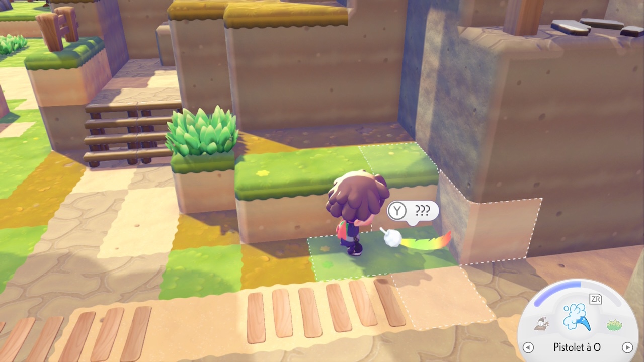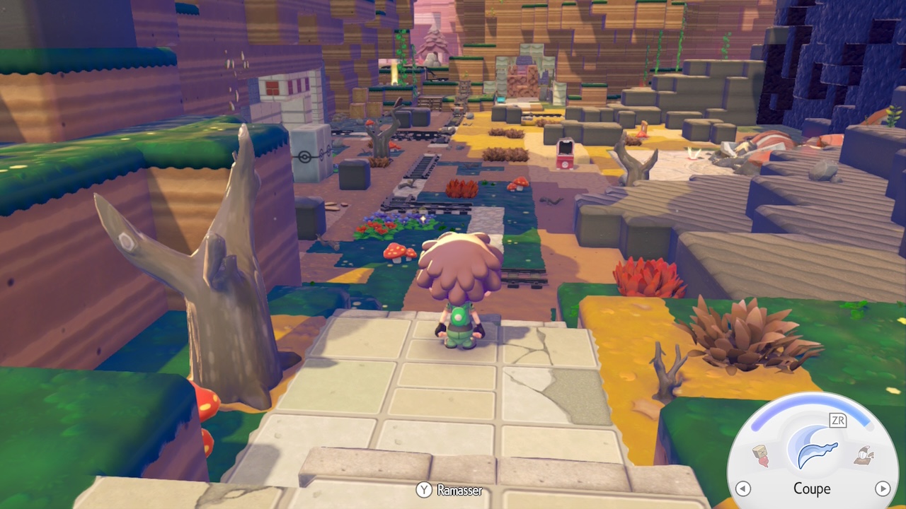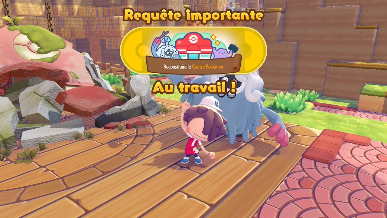 La progression passe donc dans un premier temps par des actions assez simples et qui permettront de manipuler progressivement les différentes mécaniques de base. On retravaille le dénivelé, on récolte des « crasses » qui s’avèreront finalement utile aux constructions avec raffinage et on débloque aussi de nouveaux outils et capacités pokémon. Le jeu guide véritablement le joueur dans ses premières heures avec des objectifs clairs, avant d’ouvrir progressivement l’exploration et les activités disponibles.