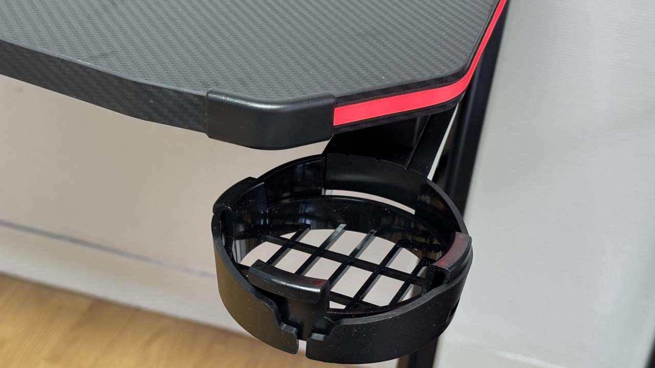 D’autre part, le Trust GXT 710 dispose d’un support de casque et de tasse sur les côtés. Ceux-ci peuvent être disposés comme bon nous semble puisque facilement détachables. Ils pourront même être rabattus sous le bureau s’ils ne s’avèrent pas utiles à certains moments.
