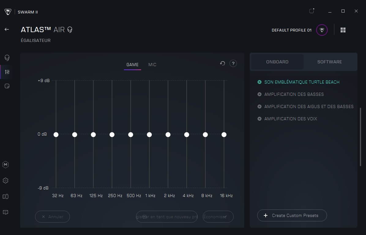 Le casque offre plusieurs préréglages sonores via l’application Swarm II, bien que l’absence de bouton de changement de mode sur le casque soit regrettable. Les réglages comme le Noise Gate et le monitoring du microphone peuvent être ajustés via l’application pour une personnalisation accrue.
