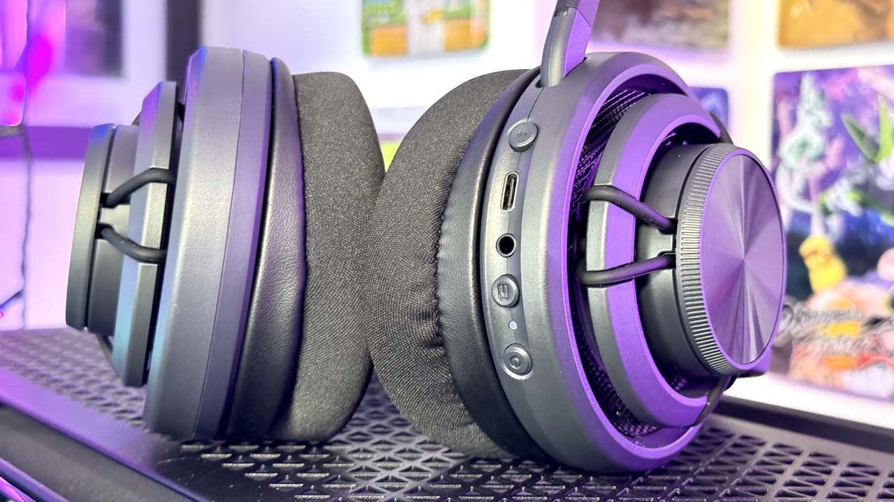 Les commandes comprennent un bouton d’alimentation, un bouton de changement rapide entre Bluetooth et 2,4 GHz, un port de charge USB-C, un bouton de couplage Bluetooth et une molette de volume. Le microphone détachable est activé lorsqu’il est abaissé et mute lorsqu’il est relevé, avec un filtre anti-vent inclus pour une meilleure qualité sonore.