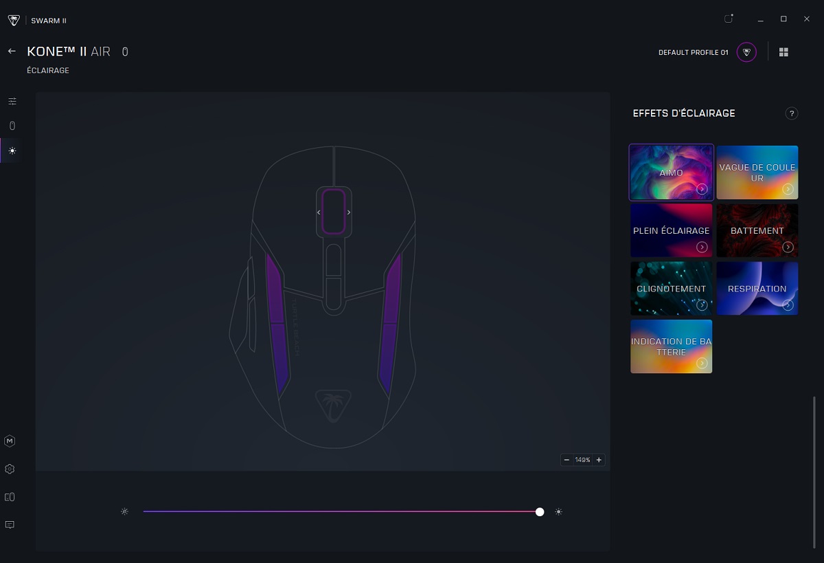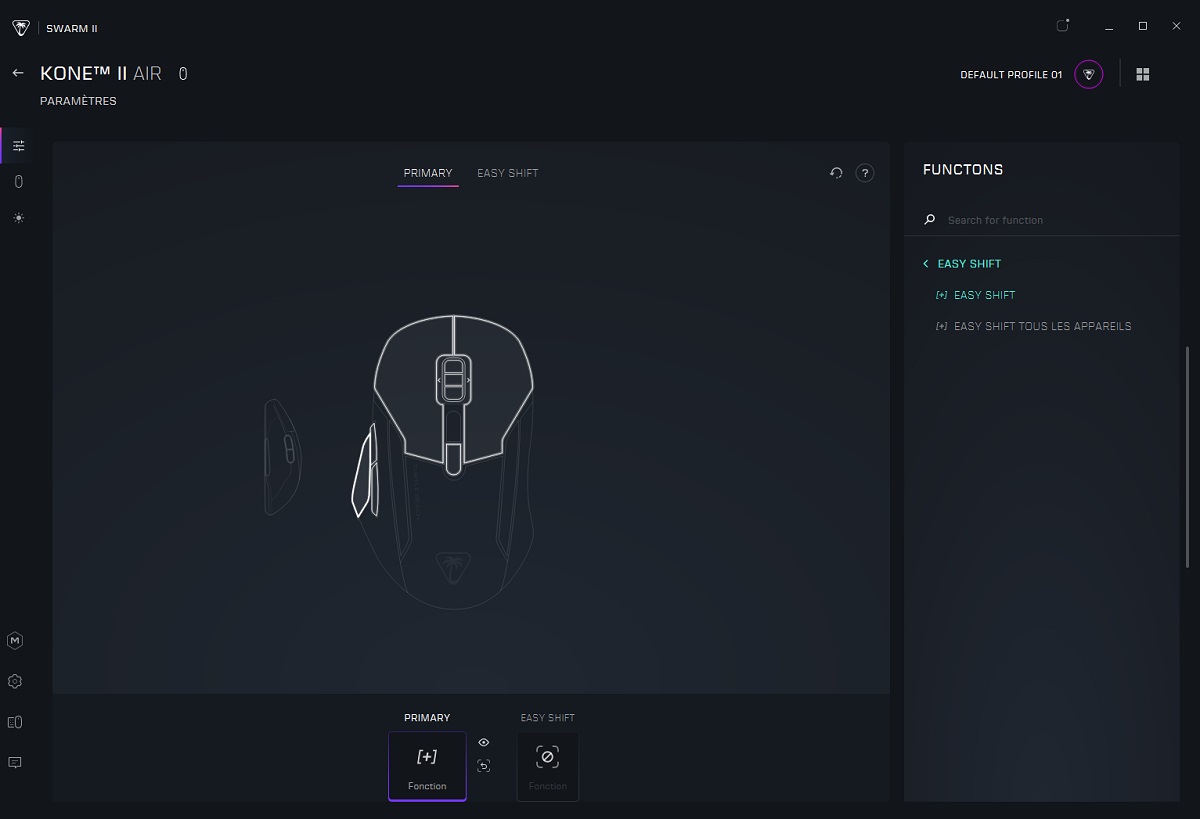 Le logiciel Swarm II de Turtle Beach permet de personnaliser chaque aspect de la souris, des réglages DPI à la taux de rafraîchissement, en passant par les effets de lumière RGB. En combinant tout cela avec le mode Easy-Shift, on peut aisément configurer le Kone II pour s’adapter à n’importe quel jeu ou tâche.