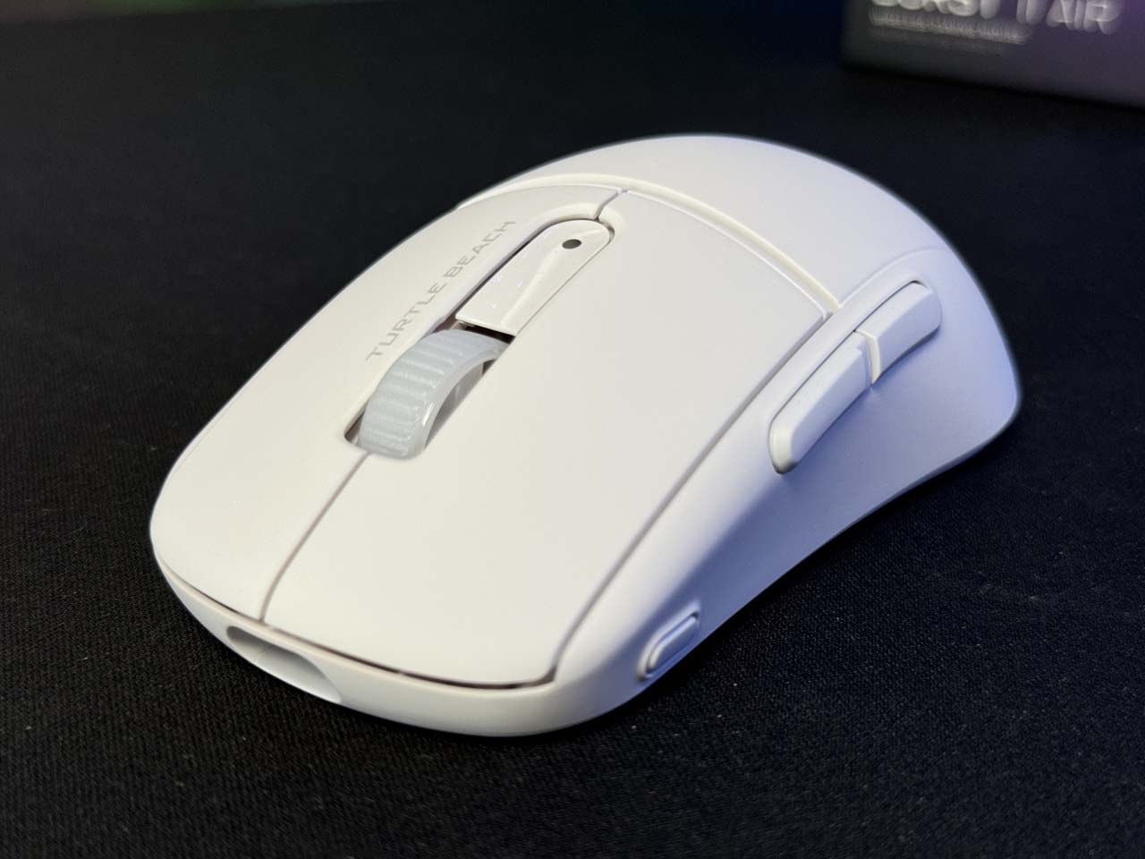 Sa finition montre une texture douce avec une légère adhérence, qui empêche les doigts de glisser même dans des conditions de chaleur ou d’humidité. Comparée à d’autres modèles, la Turlte Beach Burst 2 Air n’est ni trop lisse ni trop rugueuse, mais offre une sensation équilibrée qui devrait convenir à la plupart des utilisateurs. Les grips inclus peuvent être collés au châssis pour une adhérence plus importante, mais la légèreté de la souris aide déjà à ça. Leur utilisation sera donc purement subjective.