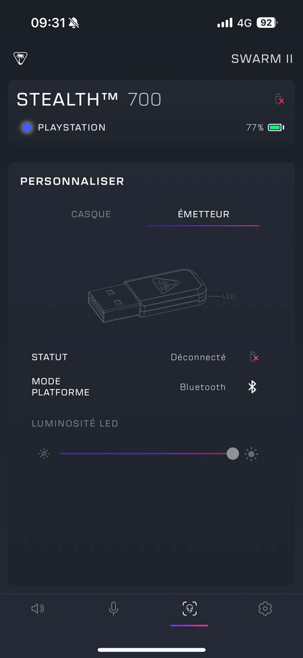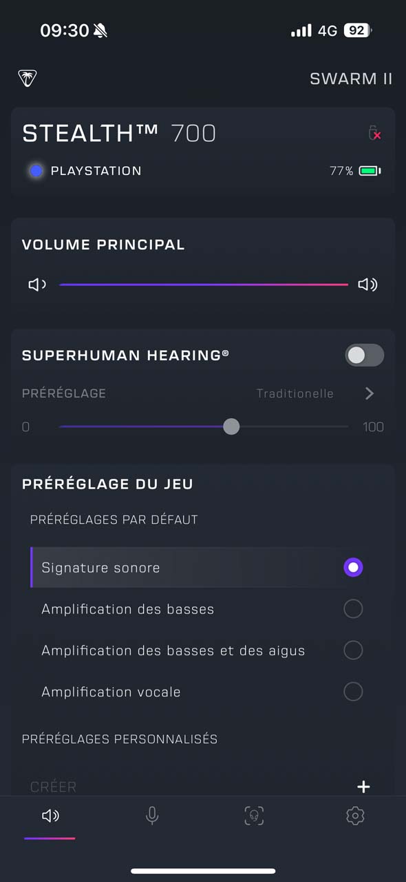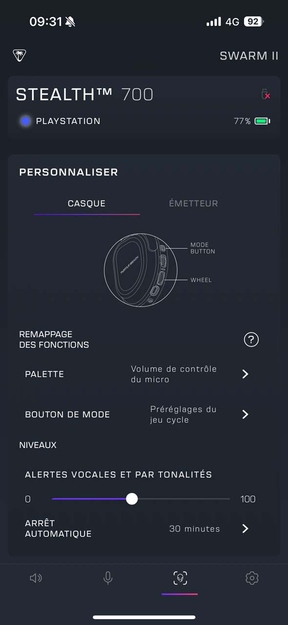 Le Stealth 700 Gen 3 s’offre des options vraiment pensées pour un usage quotidien chez les joueurs. Les commandes sont bien placées sur les oreillettes, avec un bouton Mode permettant de basculer entre les différents préréglages audio et une molette pour le réglage du volume. Via l’application mobile, vous avez accès à une personnalisation avancée du son, que vous pouvez ajuster en fonction de vos préférences : amplification des basses, clarté des aigus, et même des options de réglage pour le microphone.